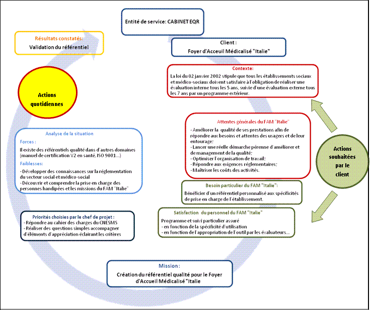 projeter. Dans ce contexte réglementaire clair, je suis intervenue dans un Foyer d’Accueil Médicalisé FAVERIS, prenant en charge des personnes handicapées vieillissantes, pour le compte du Cabinet Conseil EQR, Evaluation de la qualité et des risques, afin de les accompagner dans la mise en place de l’évaluation interne. En parcourant ce rapport, vous découvrirez comment j’ai créé un référentiel qualité accompagné de son fichier d’autoévaluation automatisé, avec pour objectif de répondre aux exigences du client et à celles de la réglementation. |