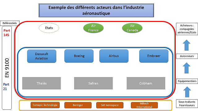 Afin de mieux appréhender les différentes relations qui s’opèrent dans l’industrie aéronautique et sous quel(s) référentiel(s) elles sont soumises, voici un exemple dans la figure ci-dessous.