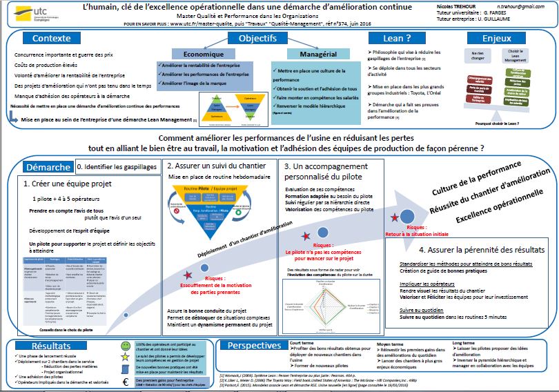 Actuellement étudiant en dernière année de Master Qualité et Performance dans les Organisations à l’Université Technologique de Compiègne, je dois, afin de valider mes compétences, réaliser un stage de fin d’étude de 5 mois en entreprise. J’ai choisi de réaliser un stage en amélioration continue au sein d’une entreprise du secteur Agroalimentaire. Je n’ai pas choisi ce secteur par affinité, mais j’ai préféré orienter mes recherches sur une mission en amélioration continue & Lean Management en privilégiant la mission et ses objectifs plus que le secteur d’activité. De plus j’ai réalisé auparavant un stage au sein d’un service Qualité d’une entreprise du secteur automobile avec pour mission de préparer l’audit de surveillance du système de management intégré Qualité, Sécurité, Environnement. C’est pourquoi, pour comparer entre mes deux stages et orienter au mieux mon projet professionnel, j’ai décidé de choisir une mission plus opérationnelle, où je devrai gérer des projets d’amélioration en collaboration avec les équipes de production. J’ai voulu dans ce stage, être au contact du terrain, et des hommes qui y travaillent. De plus cela me permet de découvrir de nouveaux process de production afin de développer mes compétences techniques sur ce secteur, développer mes compétences managériales et de gestion de projet.