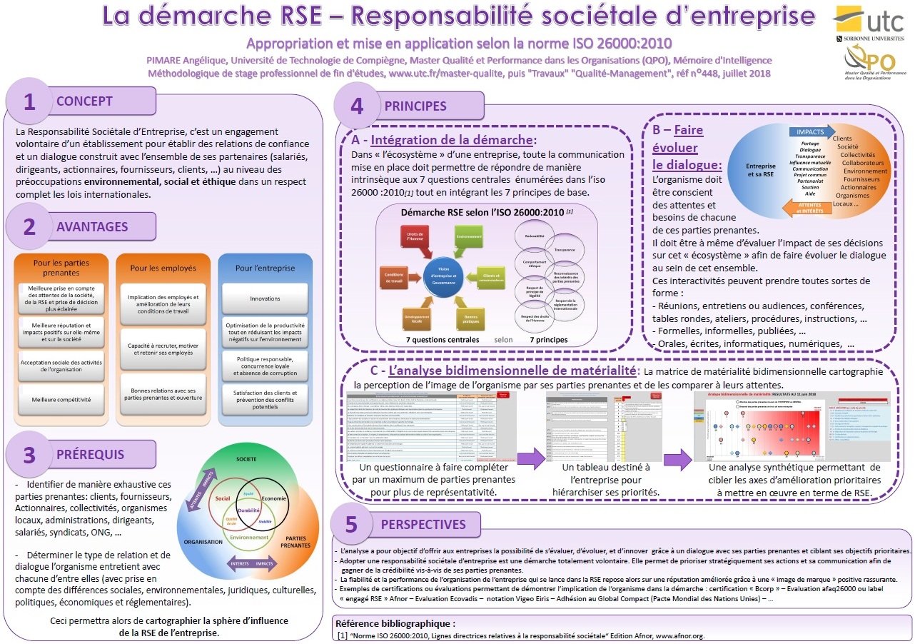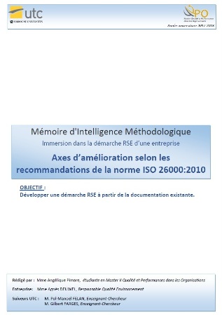 Axes d’amélioration de la RSE d'une entreprise selon les recommandations de la norme ISO 26000:2010, PIMARE Angélique, Université de Technologie de Compiègne, Master II Qualité et Performance dans les Organisations (QPO) Mémoire d'Intelligence Méthodologique du stage professionnel de fin d'études, juin 2016, www.utc.fr/master-qualite, puis "Travaux", "Qualité-Management", réf n° 448 |
