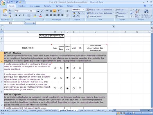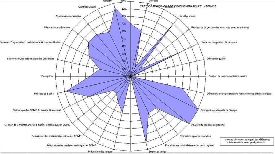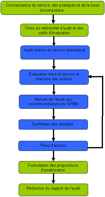 biomedical ward: With the "Guide of the Good Biomedical Practices in establishments of health", the biomedical community has a reference frame succeeded trade. Stating the minimal requirements which are essential on a service if he wants to consider to fulfill his functions, the GBPB inspires by many biomedical services which wish to set up a step of continuous improvement. The audit methodology carried out is presented here. Keeping the GBPB like reference frame, this methodology calls upon several tools of evaluation and appreciation which, combined, make it possible today the ward to know its strong points and its weak points and to choose its objectives quality consequently.